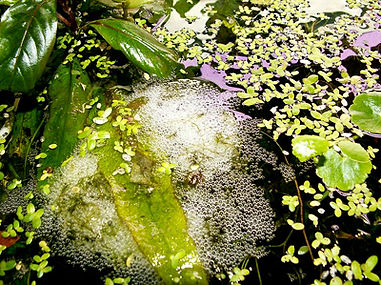 It is fascinating to watch the fry develop in the bubble-nests. At first they manifest as tiny dark spots. Then, within two days, you should see tiny slivers of tails hanging from the underside of the nest — hundreds of them in each nest — Soon you should see the fry bouncing out of the nest and then floating back up into the mass.