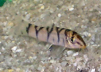 The Bengal Loach is a fairly small loach in the aquarium, but with a beautiful body color. In the wild they can get up to 6 inches (15.2 cm) in length. However they only reach about 2 1/2 inches (6.5 cm) in the aquarium, with a lifespan of about 5 - 8 years. Its body is golden overall with 8 to 10 vertical black cross bands, sometimes connected in places. The banding starts just behind the eyes and extends all the way onto the tail fin. In the adult the color patterning becomes more subdued, the cross bands widen and their number can increase.