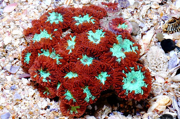 The colors of the Pineapple Coral are unique to this species. The centers are usually green and the outer area is brown to dark red. Exciting new aquacultured specimens come in pinks, maroons and various shades of green, with centers from yellow greens to deep greens. Some other names this coral is known for are Blastomussa Coral, Pipe Blastomussa, Branched Cup Coral, Blasto Merleti, Branching Blastomussa, Blasto Pipe, Red and Green Blastomussa, and Blasto Pineapple Coral.