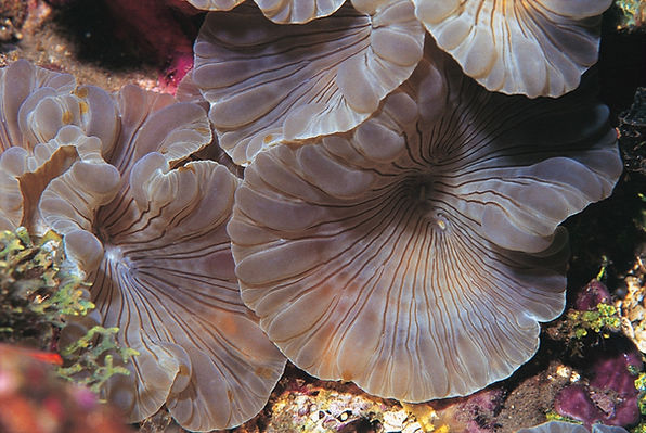 The Fox Coral is usually brownish pink or light green. Colonies are flabello-meandroid, meaning they form elongated valleys with separate septa walls. The walls are a thin fragile ridge-like skeleton, and the polyps will expand enormously in the right conditions. With their large striated ruffled polyps spreading out into flower-like shapes, they are occasionally mistaken for anemones. On the reef, the Fox Coral coral inhabits sheltered environments under overhangs in turbid waters.