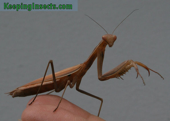 This species of praying mantis is usually light to medium brown, but there are also very dark and beige variations. They have a lot of dark and light spots on the body and legs.