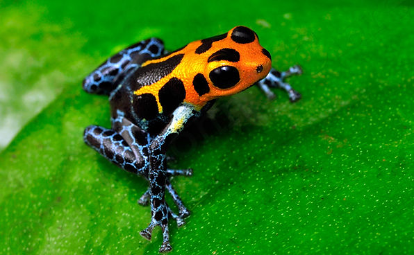 Ranitomeya and Andinobates frogs can be distinguished from those in genera such as Dendrobates in that they are generally smaller, have more than two colors, and seem to glitter if viewed from certain angles. Ranitomeya is widespread in the Amazon basin, whereas Andinobates species are found only in the northern Andes down to Central America.