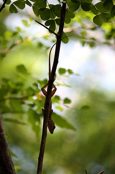 Activity patterns vary between populations, though the species as a whole is generally most active during the cooler hours of the day.[39] In xeric woodland on Dominica's west coast, it is active throughout the day with peaks at dawn and dusk, while in rain forest populations, it is typically inactive during the middle of the day, remaining at high perches.[40] At night, the Dominican anole climbs to the tips of branches and sleeps clinging to leaves, where heavier nocturnal predators cannot reach them.[41]