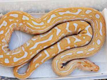 Sometimes referred to as Amelanistic, or the T- albino form of Burmese Python. The Albino Burmese Python was the first ever real investment reptile that paved the way for most of what is out there today. Albino Burmese Pythons wer first reproduced by Bob Clark in 1986. I strive to produce high contrast Albino burms, that keep their contrast into adulthood. As babies they have dark orange dorsal spots circled by white on a orange/yellow background. When they mature the dark orange spots turn more yellow, and a lot of times the orange bleeds into the white coloration which can make for a pretty dull looking adult. For an affordable, attractive giant python an albino Burmese Python is hard to pass up. I have some very genetically diverse albinos, and normally have ones that are het for either lab, green or granite.