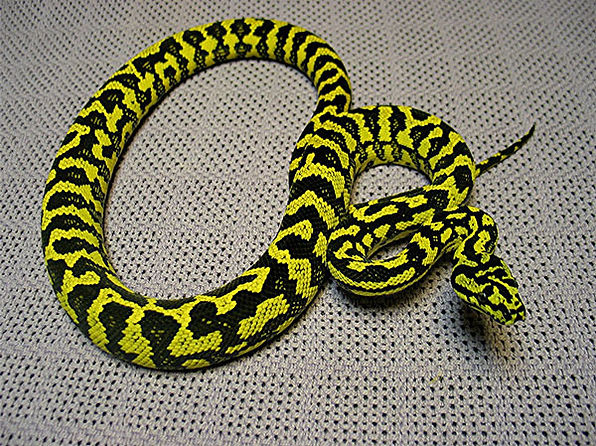 The carpet pythons are a diverse group of snakes from the Morelia genus that are native to a wide variety of biotopes in Australia and New Guinea. They are called carpet pythons because they exhibit a dazzling array of patterns and colors that mimic the beautiful woven carpets found in the Middle East. Collectively they are considered a hardy, medium size python with fairly easy captive care requirements. The more common carpet pythons available in the pet trade include jungle carpet pythons, diamond pythons, Irian Jaya pythons, and coastal carpet pythons. Selective breeding of carpet pythons has recently exploded with new “morphs” such as granite, caramel, jaguar and zebra carpet pythons.