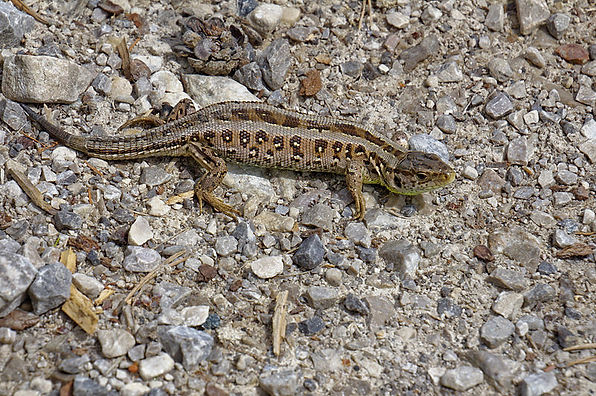 The sand lizard is a sexually dimorphic legged lizard. In northwest Europe, both sexes are characterised by lateral and dorsal strips of ocellated (eye-shaped) markings, dark patches with pale centres. Colouration varies across their European and Russian range. Males have finer markings than females, and their flanks turn bright green during the spring mating season, fading again in the late summer. Sand lizards can reach up to 25 cm (10 in) in length.[3]