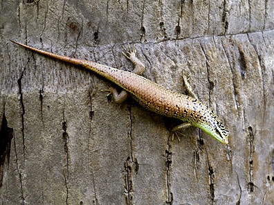 The Olive Tree Skink inhabits coastal and lowland forest, but is most easily seen on the trunks of beachfront coconut palms.